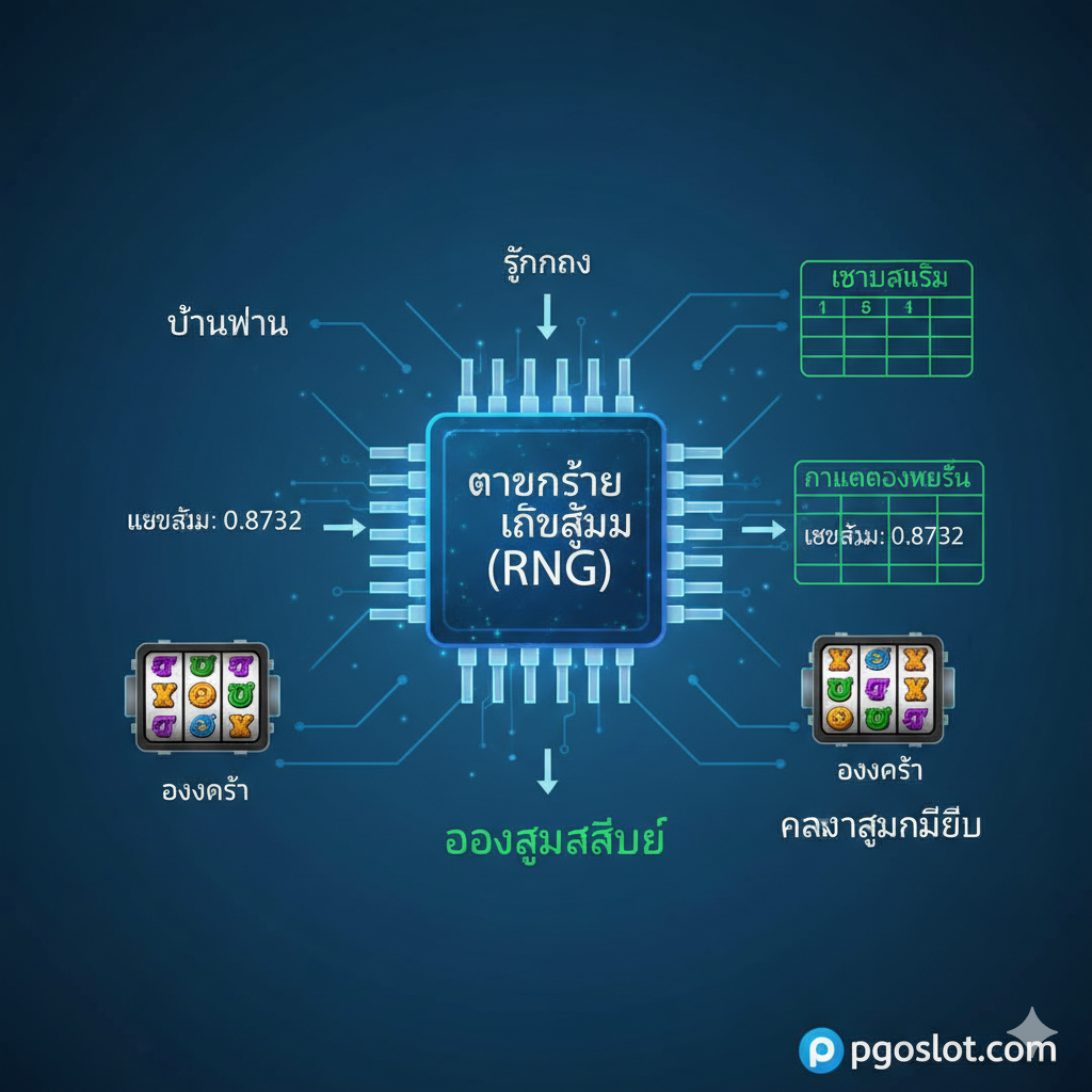 信号输入到RNG核心 -> 核心吐出随机数字(例如:0.8732) -> 数字被映射到“Virtual Reel Mapping”表 -> 结果以สล็อตวงล้อ(老虎机转轴)的形式呈现。色彩明亮,使用蓝色和绿色来代表逻辑和科技,强调“ความสุ่มสัมบูรณ์”(绝对随机性)。”>