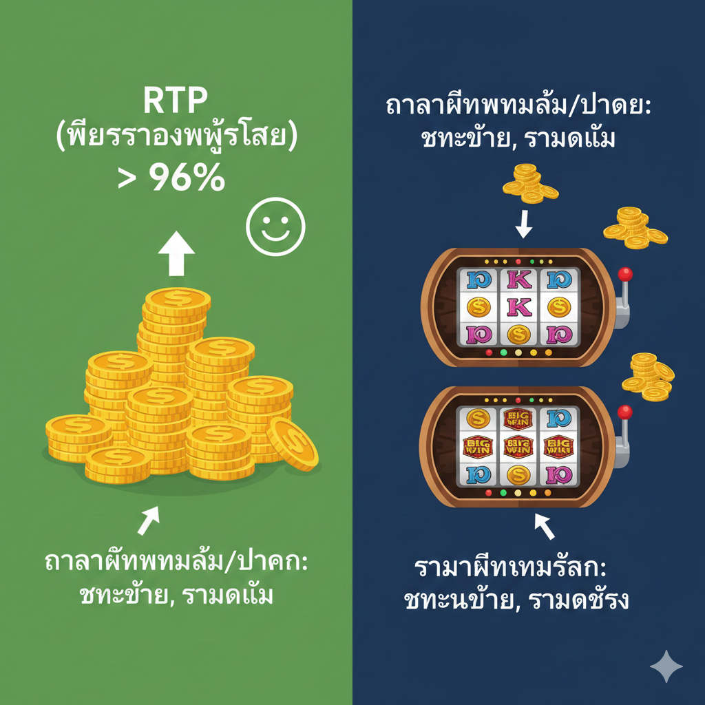 96%”字样,并配上一个友善的笑脸图标。右侧区域以蓝色或橙色为主,用两个不同的老虎机转轮示意图来解释Volatility:一个转轮显示小额แต่频繁的胜利(Low/Medium Volatility),另一个显示大额แต่稀有的Big Win或Jackpot标志(High Volatility)。整体风格应简洁、专业且易于เข้าใจ,使用泰语箭头และ短句进行标注。”>