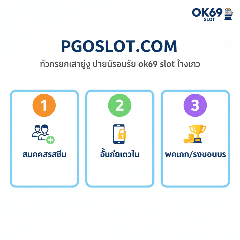 ยืนยันตัวตน -> ฝากเงิน/รับโบนัส'。画面采用信息图表(Infographic)风格,以数字1、2、3或图标(如人像+加号、手机OTP锁、金币/奖杯)引导用户。色彩应明亮、干净,如白色背景配上醒目的泰语文字และ图标,确保用户一眼就能理解如何在pgoslot.com快速完成注册และเริ่มเกม,强调流程比寻找'ok69 slot เข้าสู่ระบบ'更简单直接。”>